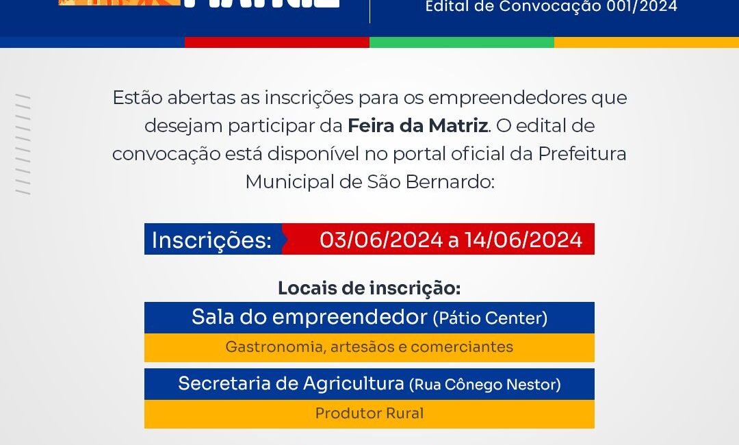 Feira da Matriz: Lista Completa de Empreendedores Aprovados e Horários Atualizados! A Prefeitura Municipal de São Bernardo, em parceria com a Sala do Empreendedor e Sebrae-MA, tem o prazer de divulgar a lista completa de empreendedores aprovados para a primeira edição da Feira da Matriz, além dos horários atualizados! A...